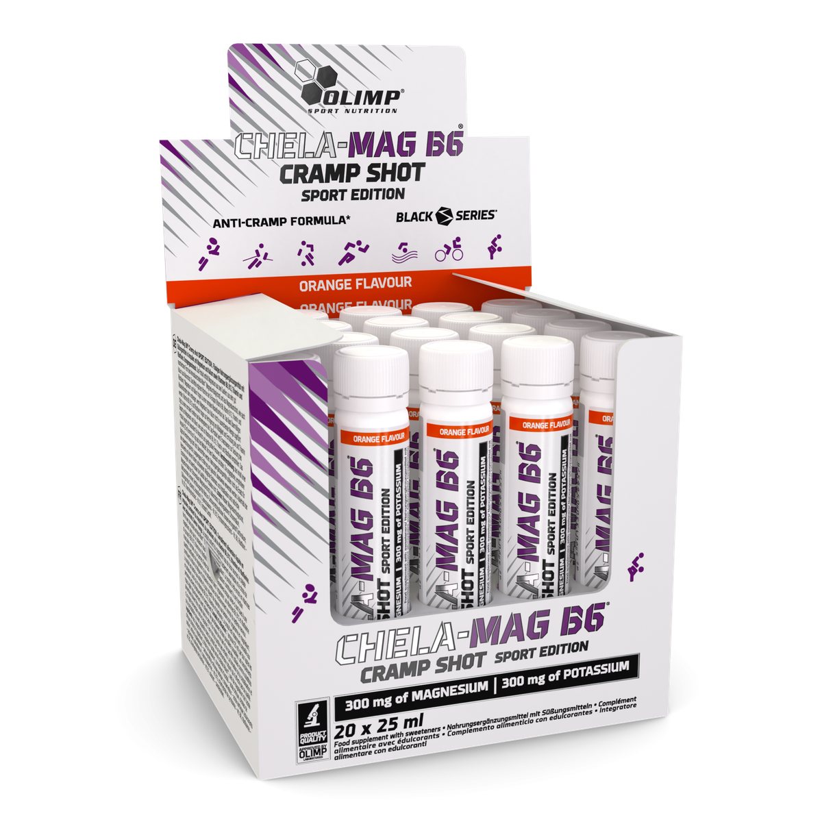 Chela-Mag B6® Cramp shot SPORT EDITION. Liquid food supplement in ampoules, containing magnesium and potassium as well as vitamins B6, B12, thiamin and riboflavin. With sweeteners. Orange flavour. The product containing magnesium from two sources – from the highly bioavailable amino acid chelate Albion™ (magnesium bisglycinate) and magnesium citrate, as well as potassium as potassium citrate. The product was completed with B-group vitamins (B6, B12, thiamin and riboflavin). *Magnesium and potassium help muscles to function properly which allows excessive contractions to be avoided in cases when they are caused by deficiencies of magnesium or potassium. Vitamins B6, B12 and riboflavin contribute to reduction of feelings of tiredness and fatigue, and thiamin helps support the proper functioning of the nervous system.